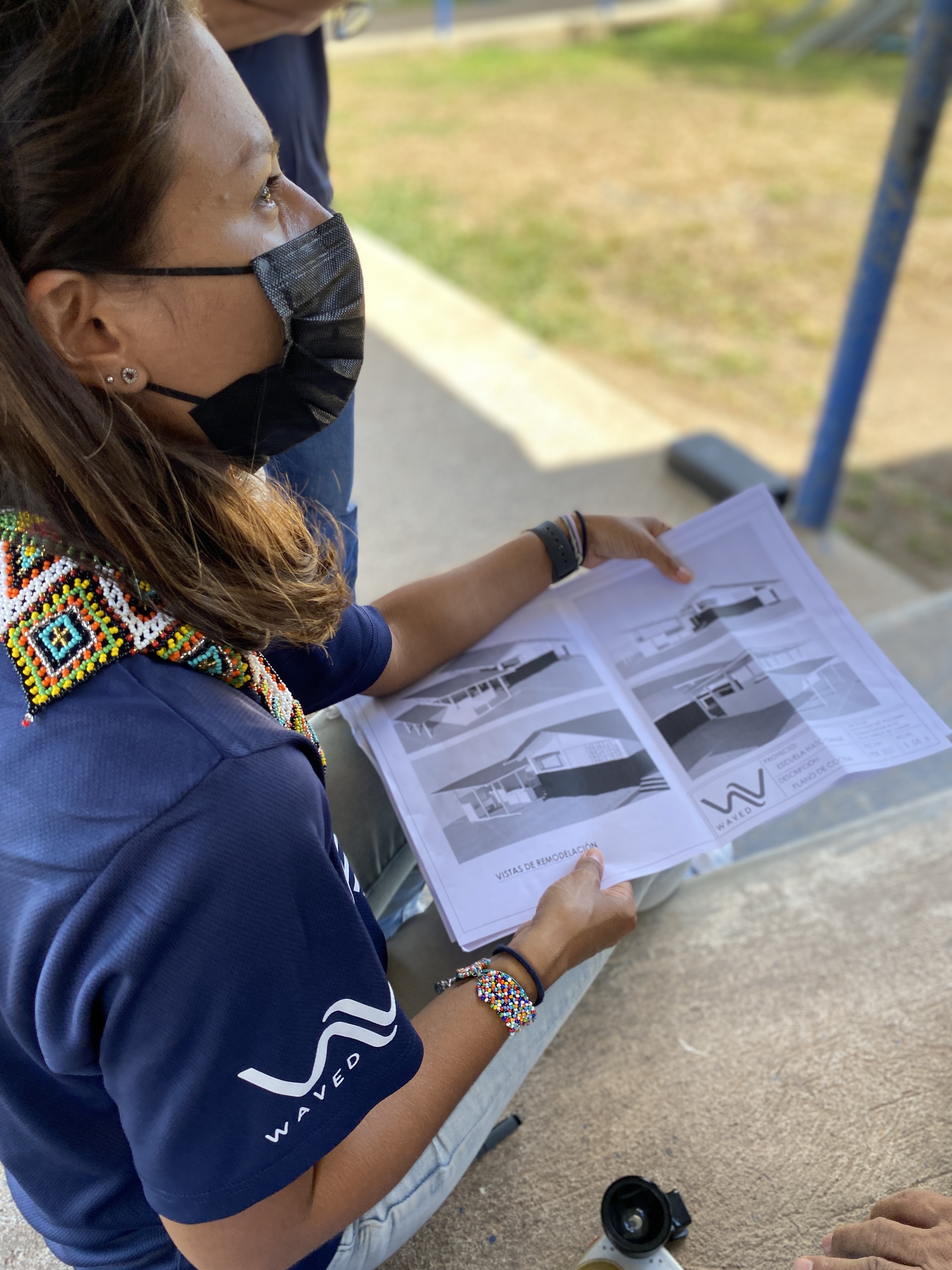 El #Team de Infraestructura liderado por Marjoury Casis, acompa帽ada por la arquitecta, Alessia Alfu y el Ingeniero Civil, Gabriel Rodr铆guez, junto al Director de la Escuela de Hato Cham铆, Migdonio Rodr铆guez, sigue trabajando en la planificaci贸n de la reconstrucci贸n de la cocina.