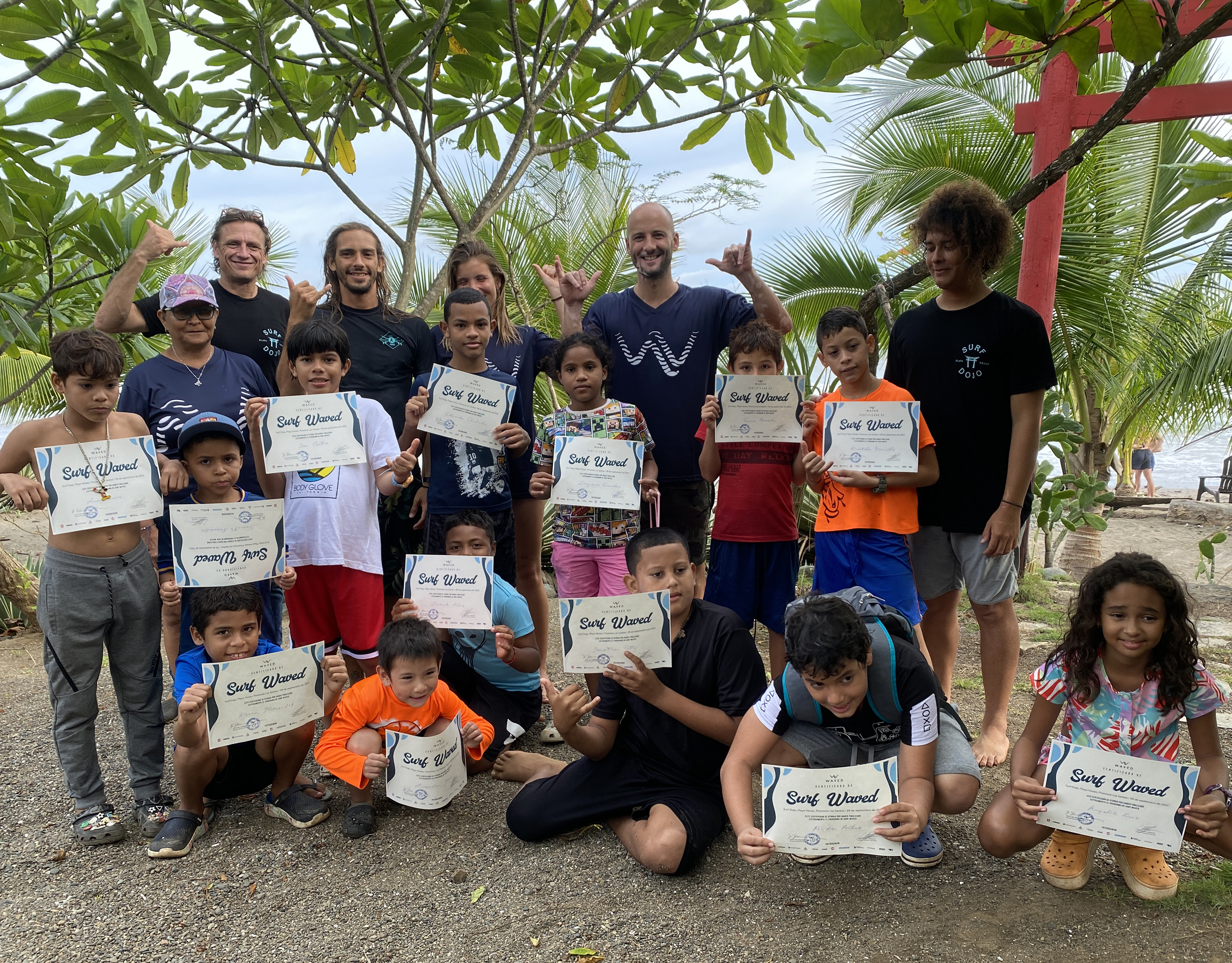 Nuestros estudiantes con sus certificados de Surf en la última clase en Venao