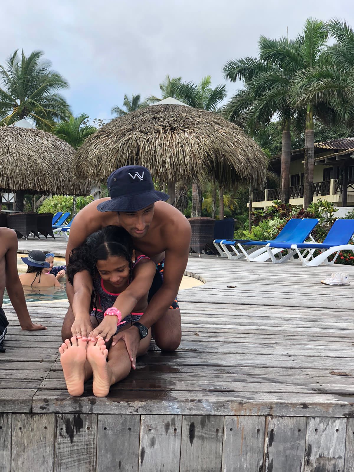 Coach Eduardo Mendoza realizando ejercicios de estiramiento con Ashly