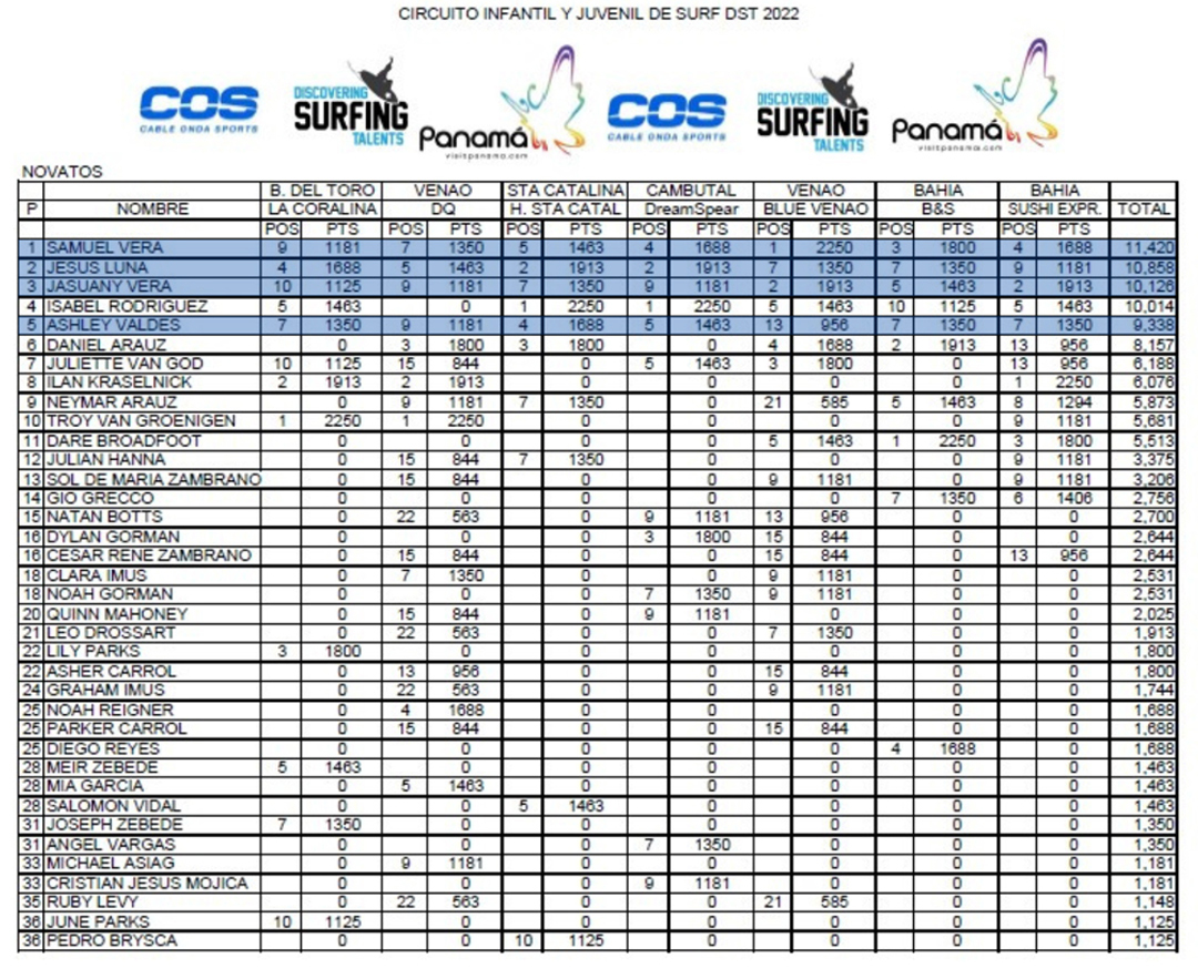 La disciplina, constancia y perseverancia dando sus mejores frutos, después de 12 meses de entrenamiento, 8 competencias, y gracias a un fabuloso trabajo entre todos del Team, juntos hacemos historia. De 36 surfistas a nivel nacional en la categoría novatos, nuestros estudiantes de Isla Cañas lograron posicionarse dentro de los primeros cinco lugares del ranking. Felicidades a nuestra coach Ana Chudnenko, quien ha sido guía y ha llevado la batuta de este gran logro, contando con el apoyo del coach Eduardo Mendoza.
