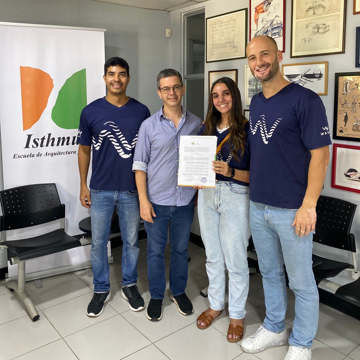Adicionalmente, aprovechamos la visita a la Universidad Isthmus para reanudar nuestra alianza con ésta reconocida institución panameña. En la foto de izquierda a derecha: Gabriel Rodríguez, Gerente de Arquitectura e Ingeniería del Team. Alejandro Pachón, Profesor de Diseño Industrial de la Univ. Isthmus. Esther Basher, Arquitecta del Team. Bastian Barnbeck, Director Ejecutivo de Waved. |