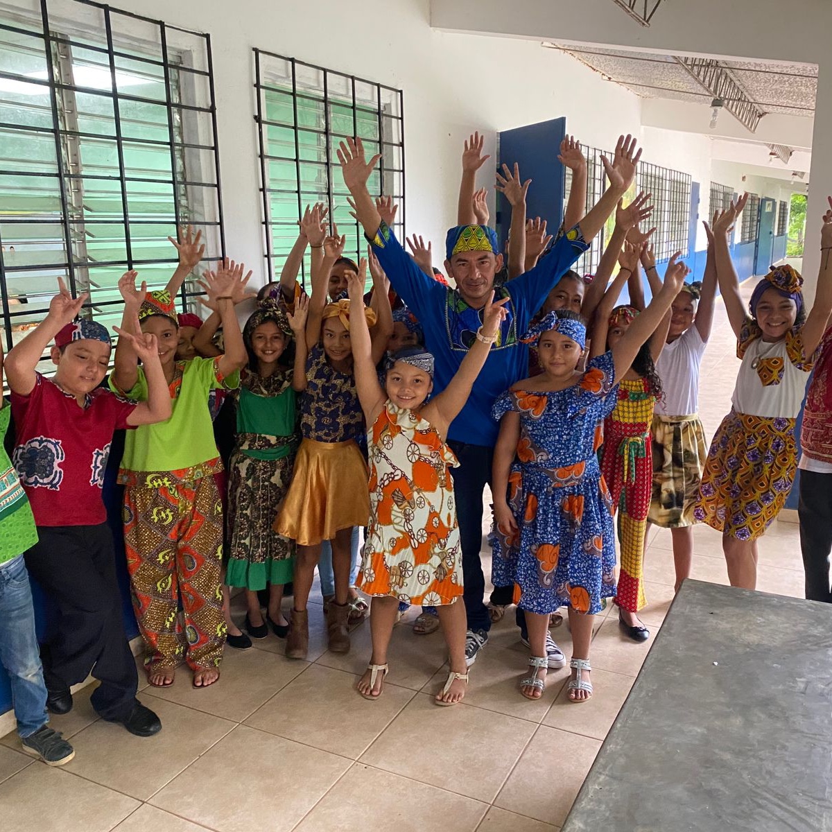 | | En la imágen, Teacher Arianne Orillac junto a sus estudiantes realizando actividades en la cancha deportiva del pueblo de Cañas. |