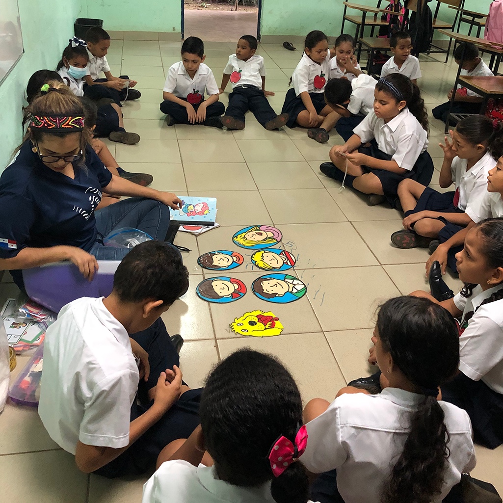 Teacher Mónica junto a sus estudiantes en el aula de clases practicando el abecedario y aprendiendo sobre las emociones en inglés. |
