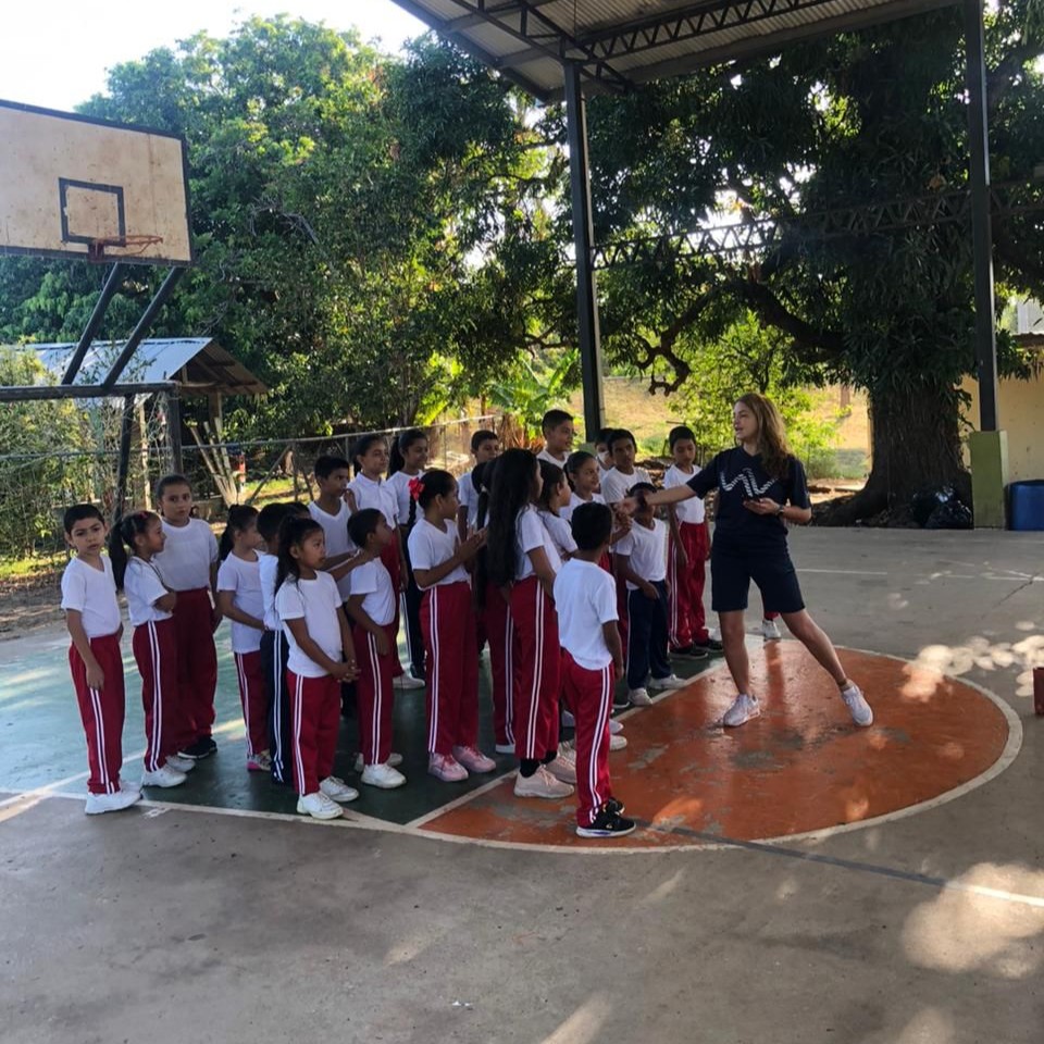 | | En la imágen, Teacher Arianne Orillac junto a sus estudiantes realizando actividades en la cancha deportiva del pueblo de Cañas. |