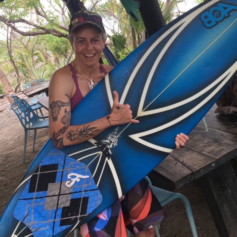 Agradecidos con los turistas por sus donaciones. Un tabla de surf y raquetas de Lacrosse. |