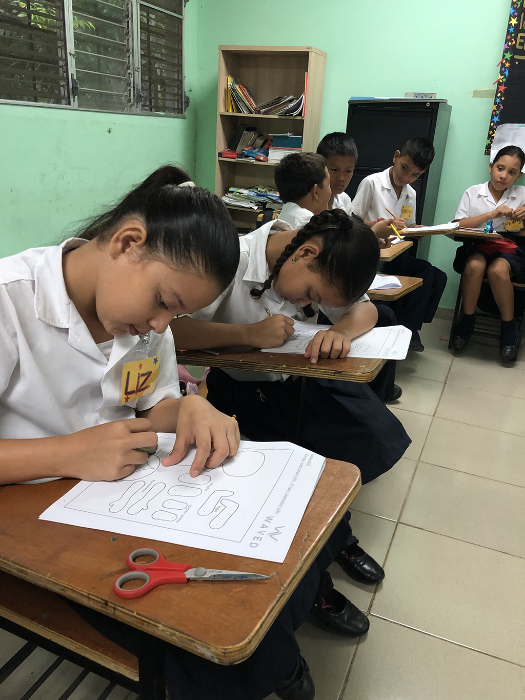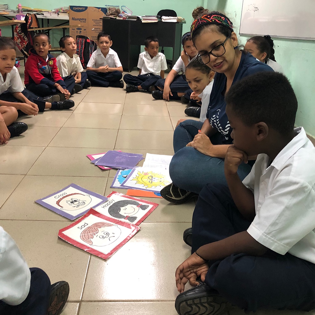 Teacher Mónica junto a sus estudiantes en el aula de clases practicando el abecedario y aprendiendo sobre las emociones en inglés. |